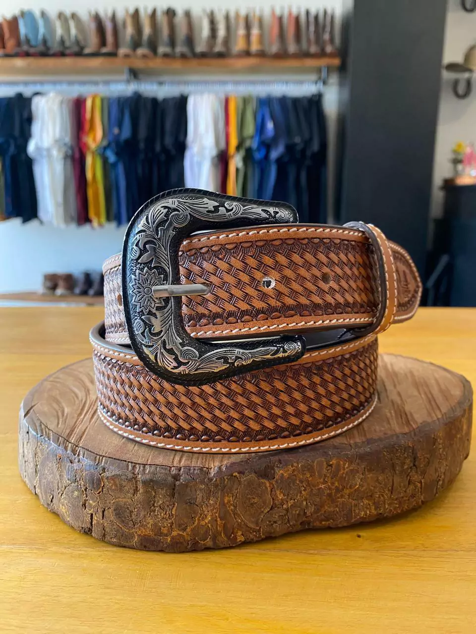 Detalhes: Cinto com detalhes em couro entalhado, fivela simples em níquel, removível.
